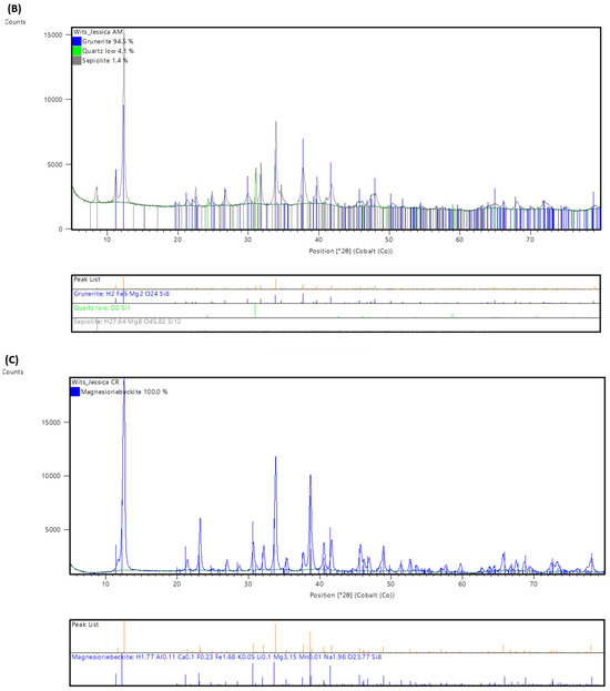 (A) Sample Ch1. Chrysotile asbestos XRD diffractogram and Rietveld refinement phases; (B) Sample Am2. Amosite asbestos XRD diffractogram and Rietveld refinement phases; and (C) Sample Cr3. Crocidolite asbestos XRD diffractogram and Rietveld refinement phases.
