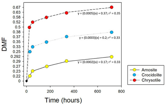 The weight loss for all three types of asbestos reached a plateau after 186 h indicating the completion of the chemical reaction. The mass loss of the experiments for each asbestos sample was summed up, although 100% solid mass loss is never achieved. The reason is not incomplete dissolution, but rather the precipitation of silica back out of the solution [23]. The dissolved mass fraction (DMF) calculated for the asbestos samples are given in Table S3 and graphically represented in Figure 4.