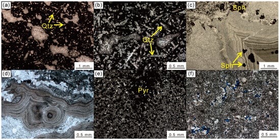 In addition to micrite dolomite and clay minerals, the dolomite with “snowflake structure” also contains a large amount of idiomorphic columnar quartz, the content of which usually accounts for 5%–25% of the volume. It has a hexagonal columnar crystal shape in the cross section and an anisotropic distribution in the micrite dolomite matrix. When the local mud content is high, the rock transparency is reduced, and the lithology should be determined as (containing) quartz argillaceous dolomite. The traditional so-called “snowflake structure” shows that dolomite aggregates of medium-coarse-grained crystalline structure are semi-oriented along slender cracks, and the two ends are interspersed in the host argilitic limestone in a “fingertip” shape, showing the structural characteristics of late hydrothermal metasomation-filling (Figure 3a,b). The “grape lace-like structure” can not only develop in the “snowflake structure” dolomite but can also exist in granular dolomite and grain dolomite. “Grape lace” is caused by partial dissolution cracks and dissolution hole edges of multi-phase fiber dolomite ring or “imbricate” superposition. It can be seen that the yellow-brown sphalerite and fiber dolomite symbiosis under the mirror, “grape lace” aggregate “fingertip”, interspersed in the powdery dolomite and quartz argillaceous dolomite. Occasionally, the sharp corners of the “fingertip” are cut by late hydrothermal dolomite (Figure 3c,d). Dolomite with “clumpy” or “brecciated” structure is strongly matched with hydrothermal transformation in terms of biological interval. In addition to the dissolution pores and holes formed by the diffusion and transformation along the fractures in the later hydrothermal solution, it can also be seen that granular pyrite, coarse crystalline dolomite, crystalline cluster quartz, and even minerals fracture fillings such as potassium salt, stone salt, and apatite (Figure 3d). The crystalline dolomite is mainly composed of powdery and fine crystalline dolomite. The former usually has diffuse idiomorphic pyrite with a particle size of about 0.03~0.1 mm, which is considered to be the product of primary synsedimentation (Figure 3e). The content of mud in the medium-fine crystalline dolomite is low, and the sand shadow is occasionally seen. Some of the rocks recrystallized to form diamond-shaped idiomorphic dolomite with a particle size of about 0.05 mm, which has an obvious sense of particle boundary, which may represent the superposition transformation of late hydrothermal dolomitization. The argilly-rich “Psammitic phantom” may be the result of relative accumulation of argillaceous components after “recrystallization” of the original rock (Figure 3f).