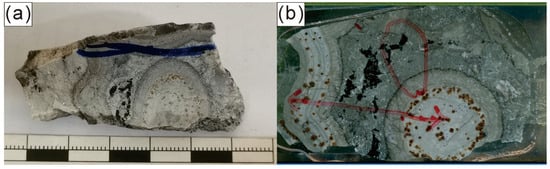 In the sixth zone (➅), the colors observed under polarized and reflected light microscopy were different from those in the previous zones. The dolomite crystals in this zone had higher transparency and exhibited “plum-pit” and “spear-like” shapes. The U–Pb ages of 57 white marble samples were determined to be 562 ± 12 Ma (Figure 6g), indicating a Late Ediacaran age. This age is consistent with the late stage of sedimentation in the Doushantuo Formation or the early stage of sedimentation in the Dengying Formation.