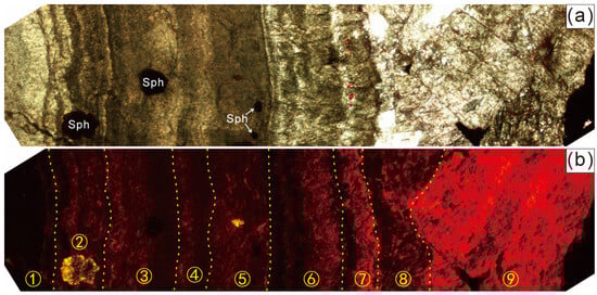 Under polarized light microscopy and cathodoluminescence examination, the sample exhibited nine distinct generations of dolomite cement that developed from the matrix edge towards the center of the pores. They represent characteristic results of successive periods of hydrothermal cementation and filling at different stages (see Figure 5). The nine generations of dolomite aggregates in the sample, from the matrix edge towards the center of the pores, were as follows: ➀ Pale yellow radial dolomite with no cathodoluminescence; ➁ yellow-brown multiband fibrous dolomite with dark red cathodoluminescence coexisting with coarse-grained sphalerite during this period (see Figure 5); ➂ and ➃ pale yellow radial dolomite with no cathodoluminescence; ➄ pale yellow radial dolomite with dark red cathodoluminescence coexisting with sphalerite during this period; ➅ pale yellow-white rimmed acicular dolomite transitioning to dark red cathodoluminescence; ➆ pale yellow-white acicular dolomite exhibiting brighter orange-red cathodoluminescence than that of the previous six generations; ➇ transparent fine-grained dolomite with no cathodoluminescence; and ➈ coarse-grained dolomite with bright orange-red cathodoluminescence.