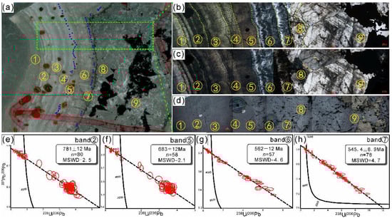 Distribution and results of multi-stage cementation dating points in cavity fillings in Well Pengtan-1 (PT1-8-1). (a) Photomicrograph of PT1-8-1 (blue dots in the figure are U-Pb test points); (b) Details of the (a); (c) Orthogonal polarization images of (b); (d) Reflective images of (b); (e) U-Pb dating results of dolomite in band ➁; (f) U-Pb dating results of dolomite in band ➄; (g) U-Pb dating results of dolomite in band ➅; (h) U-Pb dating results of dolomite in band ➆. Detailed dating data can be found in Table S1.