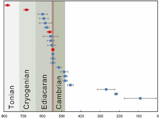 In recent years, LA-ICP-MS has gained popularity due to its high sensitivity and high spatial resolution. It has been widely applied in U–Pb dating of carbonate minerals, providing valuable insights into hydrothermal fluid activity, carbonate rock diagenesis, and the processes of oil and gas reservoir formation [,,]. Shen et al. (2019) [] dated different generations of dolomite cement in the dolostone of the Ediacaran Dengying Formation in the Sichuan Basin, China. The results provided insights into the sedimentary processes of the dolostone in the pore space, and the agreement between its age, tectonic movement, and thermal evolution history demonstrated the reliability and effectiveness of U–Pb dating of carbonate rocks. In the initial studies of carbonate mineral dating in the Ediacaran strata, previous researchers sampled and tested the Dengying Formation (551–541 Ma) from different regions. The research obtained age data from multiple phases, including 618–577 Ma, 556–543 Ma, 545–454 Ma, and 268–216 Ma (Figure 8). According to the stratigraphic classification of the Yangtze region for the Ediacaran strata, the sampling locations were all within the Dengying Formation (551–541 Ma), representing the late Ediacaran period. It is evident that some of the obtained data exceeded the age represented by the strata. However, it is unclear from the previous studies whether there were any anomalies in the ages reported, and no geological explanations were provided for these discrepancies.