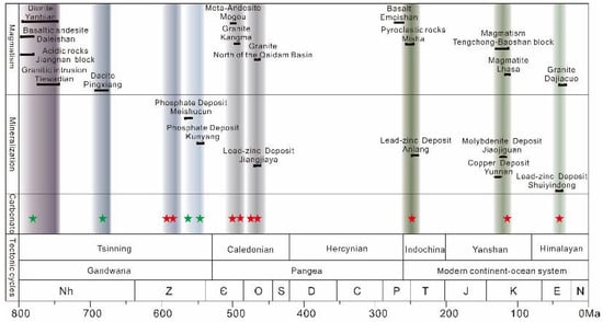 The Yangtze Plate has undergone multiple phases of tectonic rotation, while the interior of the Sichuan Basin on the western margin of the Yangtze Plate has exhibited repeated cycles of tectonic quiescence and activity [,,]. During the active tectonic phases, the region exhibited frequent faulting, the development of special sedimentary structures, intrusive magmatism, and volcanic eruption activities. These phases were characterized by the widespread occurrence of mafic volcanic rocks (basalt) and intrusive rocks (diorite), as well as the extensive distribution of intermediate-acidic volcanic rocks and intrusive rocks, and the development of conglomerate and volcaniclastic deposits [,,]. Of particular interest is the long-distance effect of hydrothermal fluids, where the tectonic-magmatic processes are likely to result in the ascent of deep-seated and even mantle-derived fluids along faults into shallow sedimentary formations such as the Ediacaran Dengying Formation, Cambrian Longwangmiao Formation, Permian Qixia–Maokou Formation, and even the Triassic Feixianguan–Jialinjiang–Leikoupo Formation. These carbonate rock units bear strong evidence of intense hydrothermal geological processes [,,,]. Scholars have indeed found a significant correlation between various types of mineralization systems, including their sources, hydrothermal activities, and mineralization ages, in the western margin of the Yangtze Plate through studies employing lithological analysis, rock geochemistry, isotope geochemistry, and zircon U–Pb dating (Figure 9). These studies have shed light on the connection between these mineralization processes and supercontinent rifting [,].