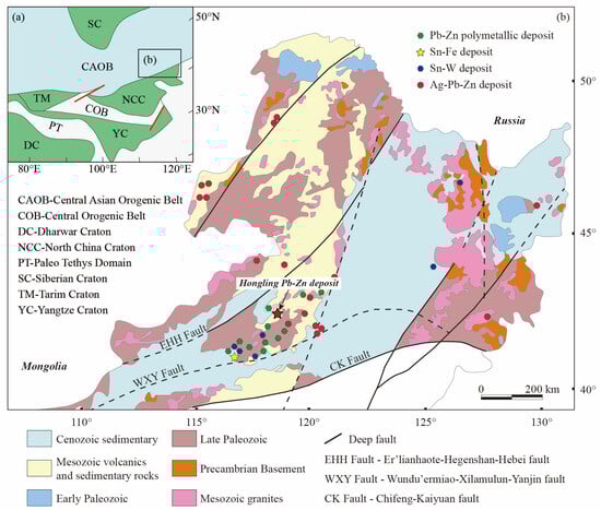 - Shan, X.Y.; Wei, L.M.; Ren, G.S.; Chen, J.D.; Liu, A.X.; Xie, Y.L. Geological characteristics of Hongling Pb-Zn polymetllic deposit in Inner Mongolia. Acta Petrol. Et Mineral. 2022, 41, 628–642, (In Chinese with English Abstract). [Google Scholar]