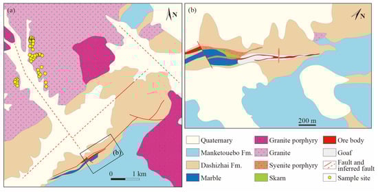 - Wang, C.Y.; Li, J.F.; Wang, K.Y.; Yu, Q.; Liu, G.H. Geology, fluid inclusion, and stable isotope study of the skarn-related Pb-Zn (Cu-Fe-Sn) polymetallic deposits in the southern Great Xing’an Range, China: Implications for deposit type and metallogenesis. Arab. J. Geosci. 2018, 11, 1–23. [Google Scholar] [CrossRef]