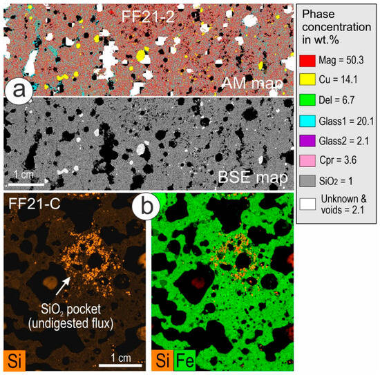 (a) Automated Mineralogy (AM) map and corresponding backscattered scanning electron (BSE) map for sample FF21-2. The legend shows modal mineralogy in wt.%. (b) Micro-X-ray fluorescence maps as labelled showing a large pocket of SiO2 representing undigested flux. Abbreviations: Cpr—cuprite, Cu—copper; Del—delafossite, Mag—magnetite.