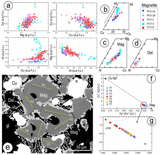 (a) Binary plots of minor elements in magnetite (Mag): Co vs. Mg; Co vs. Cu; Al vs. Cu; and Mg vs. Al. Note Co is positively correlated with Mg but negatively with Cu. Mg (b–d) Ternary Cu-Al-Co and Al-Mg-Co plots for magnetite (b,c) and delafossite (Del) in (d). Both magnetite and delafossite show linear correlation between Co and Mg relative to Al. (e) BSE image of a magnetite aggregate (sample FF21-B) with EPMA spot analysis (visible as dark circles) conducted along seven profiles (P1–7) marked as yellow arrows. (f) Binary plot: Cu2+ (a.p.f.u.) vs. Fe3+/(Cu2++Fe3+) for data along the seven profiles in (e). Note the points cluster close but slightly offset to the tie-line between magnetite and cuprospinel (Cu-spl). (g) Detail from data cluster in (f) showing the spread of analytical points within individual profiles. Other abbreviations: Cu—copper; gl—glass.
