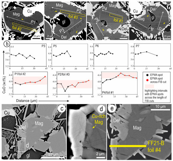 (a) BSE images showing the four magnetite (Mag) grains in Figure 5e with location of foils prepared from sliced extracted (yellow rectangle) along three of the seven EPMA profiles. Delafossite (Del) lamellae arrowed in yellow. (b) Plots of CuO (wt.%) vs. distance along each of the seven profiles. Red overlay shows the CuO interval for the three profiles selected for nanoscale study. (c–e) BSE images of magnetite with a small Cu-rich area towards the boundary in sample FF21-B. Location of foil #4 across the Cu-rich magnetite in (e). Other abbreviations: Cu—copper; gl—glass.
