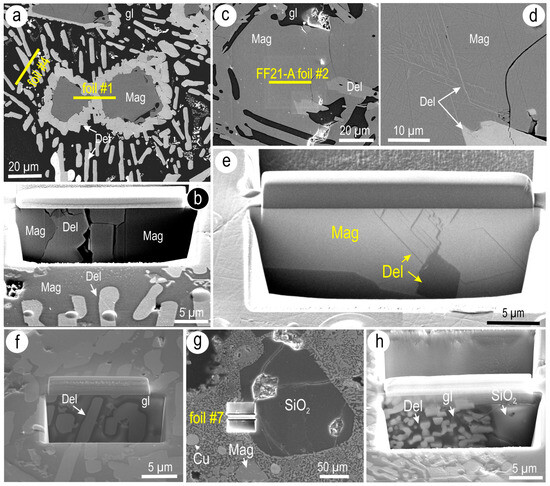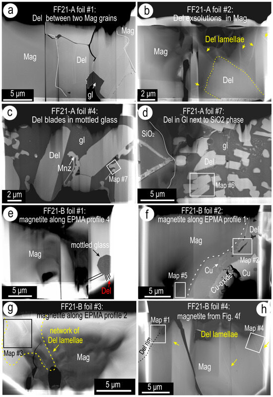 The relationships between magnetite and delafossite, as well as the characteristics of bladed delafossite in glass, were assessed in foils extracted from sample FF21-A (Figure 7). Delafossite as rims around two magnetite grains joined together extends at a ~10 μm depth, after which they become separated by a sliver of glass (Figure 7a,b). Denser lamellae of delafossite occur at the tip of other inclusions in magnetite (coarser delafossite and glass; Figure 7c,d). Such lamellae extend to a depth of ~5 μm from the sample surface but terminate at the tip of a buried delafossite inclusion (Figure 7e). Bladed delafossite in glass was extracted from a field adjacent to the magnetite grains shown in Figure 7a, and from the boundary to a ~250 μm-sized grain of silica (Figure 7f–h).