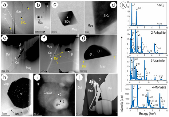 (a–i) HAADF STEM images showing silica (SiO2), glass (gl), and copper inclusions in magnetite (Mag). Note delafossite (Del, arrowed) present as lamellae or marginal rims in magnetite. (a,b) Silica nanoparticles (NPs) along trails crosscutting delafossite lamellae. (c,d) Details of rhomb-shaped silica NPs, attributed to high cristobalite. (e) Glass crosscut by a filament of copper along the contact between rim delafossite and magnetite. (f,g) Mottled glass inclusion in an area with delafossite lamellae (arrowed). (h) Radial delafossite (arrowed) lamellae around a larger, mottled glass inclusion in magnetite. (i) Close-up of NPs comprising uraninite and anhydrite (CaSO4) from glass inclusion in (g). (j) Monazite (Mnz) filament attached to delafossite blade in glass. (k) Spectra for inclusions as labelled from areas numbered on the images in (c,i,j).