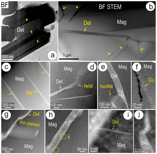 Bright field (BF) STEM images (a,b) and HAADF STEM (c–j) showing delafossite (Del) characteristics. (a) Misorientation between lamellae in delafossite seen as strong diffraction contrast in BF-STEM mode. (b) Set of delafossite lamellae along <111>magnetite (Mag). (c–e) Variable morphology and thickness of delafossite lamellae in magnetite. (f) Array of copper NPs in magnetite. (g–i) Branching of delafossite. Note narrow, few nm-wide lamellae in (i). (j) Distortion of magnetite lattice in the surrounding area of twisted delafossite.