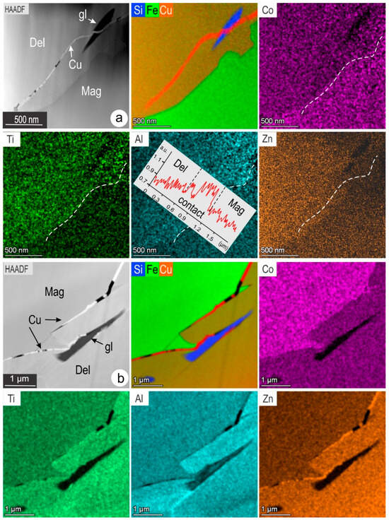 (a,b) Images and STEM EDS maps #1 and 2 (marked on Figure 8) of contacts between marginal delafossite (Del) and magnetite (Mag) showing distribution of minor/trace elements. In (a), Al profile across the boundary between the two phases shows an increase at their direct contact. Cu—copper; gl—glass.