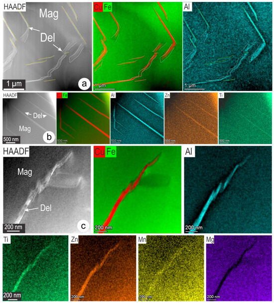 STEM EDS maps of delafossite as rims and lamellae in magnetite are shown in Figure 11 and Figure 12, respectively. Marginal delafossite is enriched in Ti and Zn but depleted in Co relative to magnetite (Figure 11a,b), concordant with EPMA data (Table 1 and Table 2; Supplementary Materials Table S3). Aluminum shows slight enrichment at the direct contact between the two minerals (profile in Figure 11a), but, otherwise, Al is always higher in magnetite relative to marginal delafossite (Figure 5c,d). STEM EDS maps of delafossite with bent lamellae show that these are, in contrast, clearly enriched in Al relative to the host magnetite (Figure 12a). Enrichment in Al, Zn, and Ti relative to the host magnetite is also observed in parallel sets of delafossite lamellae (Figure 12b). Higher-resolution maps of the branched and twisted delafossite in Figure 10g shows Al, Ti, Zn, and Mn enrichment relative to magnetite, whereas Mg is clearly depleted in delafossite (Figure 12c).