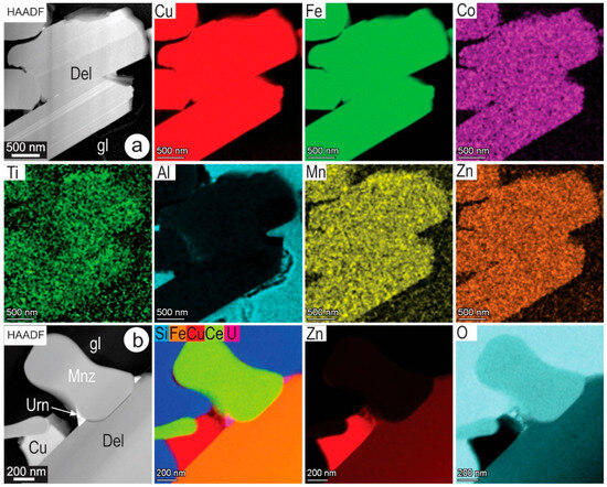 STEM EDS maps of bladed delafossite in glass are shown in Figure 13a. The maps for the delafossite with misorientation lamellae from Figure 10a do not depict any variation among major or minor elements (Figure 13a). Delafossite contains measurable Co, Ti, Mn, and Zn but only traces of Al, which is mostly incorporated within the Si-rich glass. The delafossite margins are marked by the presence of monazite, uraninite, and copper NPs (Figure 13b), indicating a close association between REE, U, and Cu with the crystallization of delafossite within glass.