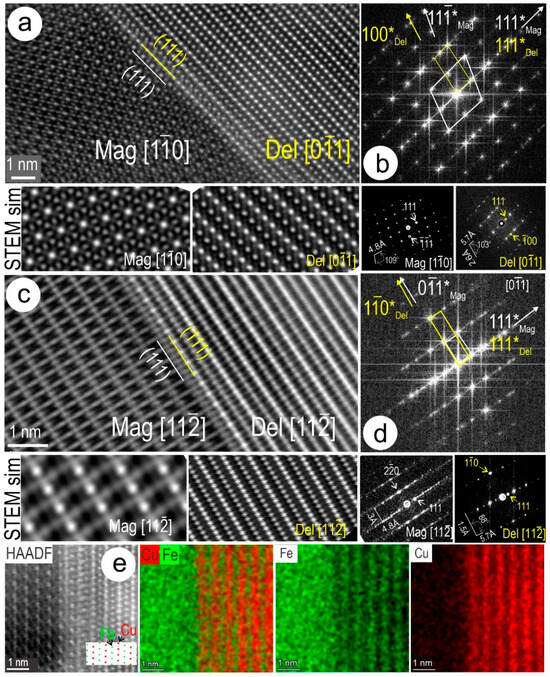 High-resolution HAADF-STEM images (a,c) and corresponding fast Fourier transform (FFT) patterns (b,d) showing epitaxial, straight contacts between magnetite (Mag) and delafossite (Del) lamellae on two zone axes for each phase as labelled in square brackets. STEM simulations for each phase are shown beneath the images. Separate FFT patterns for magnetite and delafossite are also shown for comparison. Interplanar distances are also marked. In both cases, magnetite and delafossite are coherent along (111) planes. (e) High-resolution image and STEM EDS maps showing the distribution of Cu and Fe at the boundary between [10]Mag and [01]Del. Fe and Cu model for delafossite as overlay on the image.