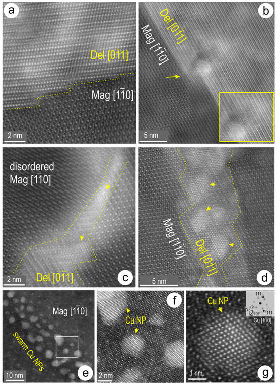 High-resolution HAADF-STEM images showing contact defects and disorder (a–d) leading to formation of copper NPs (e–g) in magnetite (Mag) host to delafossite (Del) lamellae. Orientations as marked in square brackets. Stepwise boundaries along delafossite lamellae (dashed line) in (a) associated with defect points (arrowed) and multiple layer displacements in delafossite (inset) in (b). (c,d) Distortion in delafossite leading to formation of copper NPs (arrowed) along the lamellae. Note lattice disorder in enclosing magnetite. (e,f) Details of Figure 10f along an array of copper NPs in magnetite. FFT pattern as inset in (g) shown for a copper NP.