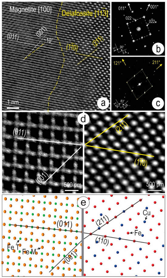 In contrast to the lamellae, marginal delafossite shows a misfit orientation with magnetite (Figure 16). Imaging the contact between [11]Del and magnetite close to [100] shows one set of coherent lattice planes (011)Del//(10)Mag (Figure 16a). The FFT patterns in Figure 16b,c show [11]Del and magnetite after being tilted on the [100] zone axis. The ~10° angle between the pair of planes with misalignment to each other, i.e., (211)Del and (001)Mag, is shown in Figure 16a and in closer detail on high-resolution images (Figure 16d). The atomic columns along the (001) planes in magnetite comprising either octahedral or tetrahedral Fe are misaligned with the columns of Cu/Fe along the (211) planes in delafossite (Figure 16e).