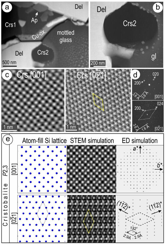 High cristobalite (Crs) identified from the margin of a large grain of silica (Crs1) at the contact with glass hosting delafossite (FF21-B foil#7) in (a) and as small, newly formed grains (Crs2) in (b). (c,d) High-resolution images and corresponding FFT patterns for Crs on zone axes as labelled in square brackets. Indexing using the crystal structure of Barth [27]. (e) Atom-fill models, STEM images, and electron diffraction simulations for the same zone axes as labelled. These show a good fit with corresponding HAADF STEM images and FFT patterns in (c,d).