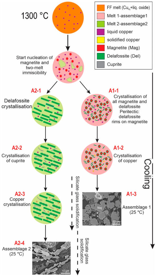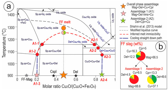 A straight down-temperature cooling path of the FF slag cannot explain the observed associations (Figure 4a,d,e): (i) the Cu-poor assemblage comprising 88.6 wt.% magnetite + 4.5 wt.% delafossite + 6.5 wt.% copper; and (ii) the Cu-rich assemblage: 49.6 wt.% delafossite + 37.1 wt.% copper + 13.3 wt.% cuprite (Figure 18b). The presence of a magnetite-free assemblage implies that the melt must have passed through an immiscibility point after magnetite nucleation but prior to delafossite formation (Figure 18a). The two paths of the crystallization process are illustrated in Figure 19.