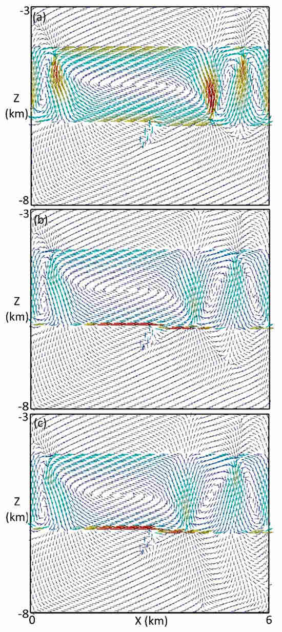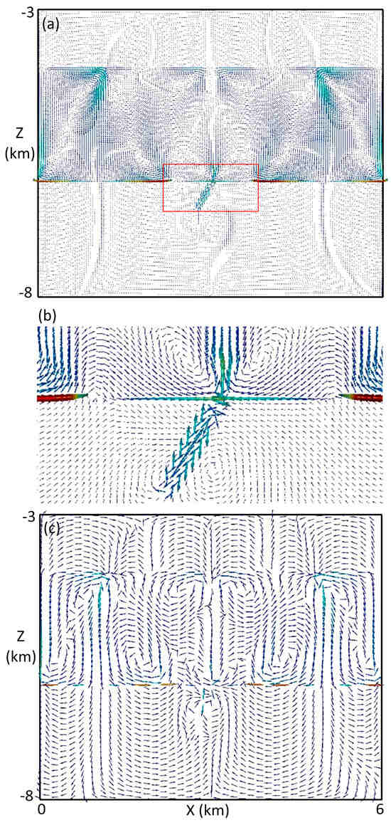 Figure 2a illustrates the fluid flow vectors at 1000 years, which was driven by buoyancy force resulting from the thermal gradient. The maximum fluid rate in the sandstone layer was three orders of magnitude greater than those in the basement and cover. Figure 2b shows an enlarged view of the fluid flow surrounding the fault zone, indicating that the left upper half of the fault zone carried an up-flow, while the right lower half carried a down-flow. Flow vectors in the cover and basement unit were too small to be identified. To better visualize the flow pattern, the original flow vectors in Figure 2a were sparsely sampled and artificially adjusted in their length, as illustrated in Figure 2c. It can be seen from Figure 2c that the convective cells in the sandstone layer were of similar size, with alternating upwelling and downwelling flow zones. Part of the basinal fluid from the downwelling flow zones percolated across the unconformity to mix with the basement brine, which also moved downwards but at a much lower rate. The basement brine then diverged and flowed upwards to join the upwelling zones in the sandstone layer. Similarly, some of the basinal fluid from the upwelling zones penetrated across the sandstone–cover interface to mix with the fluid in the cover, which also moved upwards but at a much lower rate. The fluid in the cover then diverged and flowed downwards to join the downwelling flow zones in the sandstone layer.