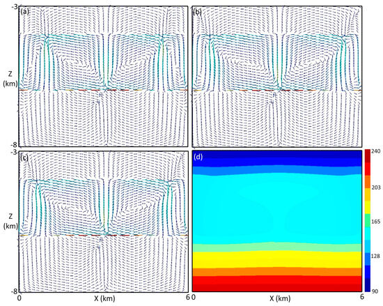 Numerical results when the paleoregolith has a thickness of 31.25 m and there is no displacement. Flow velocity vectors: (a) at 50,000 years, (b) at 150,000 years, and (c) at 300,000 years. Temperature distribution at 300,000 years (d).