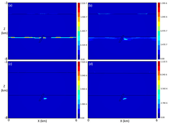 It has long been recognized that fault zones in the Athabasca Basin played important roles in ore genesis in that they not only contribute the reducing agent (i.e., methane) for the precipitation of uraninite but also concentrate mineralized fluids to deposition sites [4,29,30,31,32,33,34]. Taking into account the different local tectonic settings, the width of the fault zones varies from tens to hundreds of meters, e.g., [4,35], and the dip angle varies from extremely low to nearly vertical, e.g., [29,36,37,38]. They occur dominantly in the basement but often extend across the unconformity into the sandstone to several tens of meters [7,18,25,39]. The deepest extension of the reverse faults below the unconformity is reported to be about 400 m, although longer and shorter variants are possible [4]. Based on these constraints, in this study the fault zone is assumed to dip 59° to the left, extend vertically for 625 m (20 cells), and have a horizontal width of 112.5 m (3 cells). Figure 1a–d corresponds to a displacement of 0, 31.25 m (1 cell), 62.5 m (2 cells), and 93.75 m (3 cells) for the regolith and unconformity, respectively. The regolith is assumed to have varied thicknesses, ranging from 0 to 93.75 m (3 cells), which is constrained by previous works [4,7,8] corresponding to different numerical case studies, as presented below.