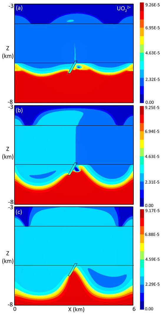 Based on the oxygen fugacity fO2 assigned to each geologic unit, two oxidation–reduction fronts occurred. One is the sandstone–cover interface, and the other is the sandstone–basement interface (i.e., the unconformity). Uranium precipitation started to occur along these two fronts when the basinal fluid percolated across the sandstone–cover interface and reacted with the more oxidizing cover fluid, and when the basinal fluid infiltrated the basement and reacted with the reducing basement brine, respectively. Figure 4a shows the precipitated uraninite at 1000 years, which is characterized by a horizontal sheet-like distribution immediately beneath the unconformity and a max volume fraction of 2.53 × 10−7. Uraninite mineralization also occurs along the cover–sandstone interface but with an even lower volume fraction. Accordingly, the concentration of UO22+ close to the unconformity in the basement was depleted due to its consumption for uranium precipitation. Thus, as time goes by, the basement brine becomes more important since it can drive deep aqueous uranium to shallow areas. As stated above, starting at 50,000 years, the basal brine was focused dominantly into the footwall area of the fault zone, which brought deep aqueous uranium up to such an area, as illustrated in Figure 5a, which shows the UO22+ concentration at 50,000 years. The aqueous uranium then reacted with the oxidizing fluid that was percolated to the basement from the overlain sandstone via the fault zone for uranium precipitation. Figure 4b illustrates the precipitated uraninite at 50,000 years. Now, more focused uranium precipitation occurs in the footwall with a higher volume fraction of 1.39 × 10−6. Therefore, the footwall area in the basement seems to represent a favorable structural trap for uranium deposition. It can be seen from Figure 5a that UO22+ experiences a significant drop in its concentration around the ore genesis site, which resulted from its consumption in precipitating uraninite. As time progressed, more basal brine was focused into the structural trap, refer to Figure 3b,c which further brought more aqueous uranium from depth to be concentrated in such a trap, as shown in Figure 5b,c. As a result, the uranium precipitation grew up gradually with time in size and volume fraction. Figure 4c shows the precipitated uraninite at 150,000 years with a max volume fraction of 7.92 × 10−6, and Figure 4d illustrates the precipitated uraninite at 300,000 years with a max volume fraction of 1.11 × 10−5. The uranium deposit was located at the same structural trap, but as time increased from 150,000 to 300,000 years, the deposit became slightly greater in its size and volume fraction.