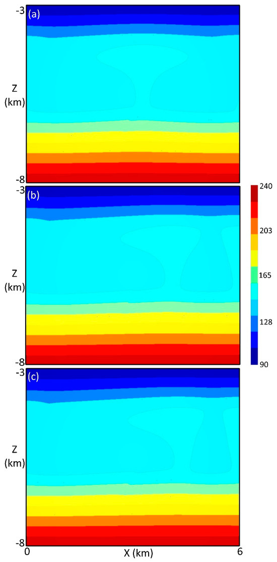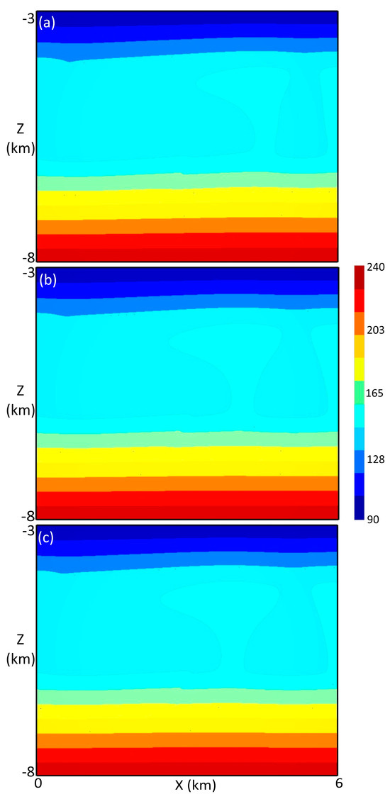 Temperature distribution at 300,000 years when the displacement of paleoregolith is fixed at 93.75 m. The paleoregolith has different thickness: (a) 0 m, (b) 62.5 m, and (c) 93.75 m.