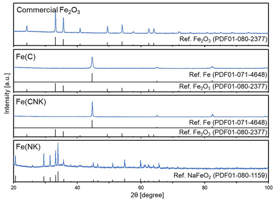 To identify the crystal structures in the commercial Fe2O3 and the prepared samples, XRD measurements were conducted for the commercial Fe2O3, Fe(C), Fe(CNK), and Fe(NK). The obtained patterns are shown in Figure 1. Clear peaks assigned to Fe2O3 without any other peaks were observed for the commercial Fe2O3. The crystallite size calculated by the Scherrer equation with a main peak at 2θ = 33.2° was 52 nm (Table 1). The results indicated that the used chemical has good purity and crystallinity that are enough to be available as a model compound obtained from iron ore. For the prepared samples of Fe(C) and Fe(CNK), the observed peaks were identified as Fe without any other peaks, especially Fe2O3. The results showed that the commercial Fe2O3 was effectively reduced to Fe by the CaH2 reducing agent, regardless of the existence of molten salt in the preparation conditions at 220 °C for 5 h. The calculated crystallite sizes from the main peaks at 2θ = 44.7° were 24 nm and 64 nm for Fe(C) and Fe(CNK), respectively (Table 1). Fe(CNK) had a crystalline size that was more than twice as larger as that of Fe(C). The results implied that the crystal growth of the reduced iron could be accelerated in Fe(CNK) more than Fe(C) to form the final large-size iron crystal after the 5 h reduction period. For Fe(NK) that was heated in molten salt without a reducing agent, very sharp XRD peaks were observed, and they were assigned to β-NaFeO2. The calculated large crystallite size of 105 nm due to the sharp peak at 2θ = 44.0° indicated the formation of well-crystallized β-NaFeO2. Since Fe is +3 valence in NaFeO2, Fe of Fe2O3 precursor was not reduced in the preparation conditions, but reacted with NaOH to form β-NaFeO2, probably following Equation (1):