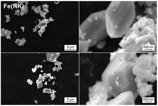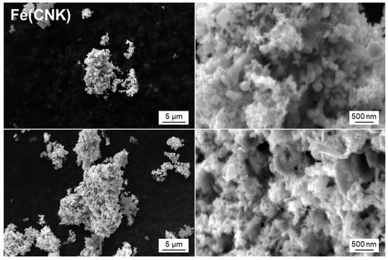 The morphologies of the commercial Fe2O3, Fe(C), Fe(CNK), and Fe(NK) were observed by SEM. The obtained SEM images are shown in Figure S1 and Figure 2, Figure 3 and Figure 4, respectively. For the commercial Fe2O3, irregular lumps were observed over the micron-sized vision, but it was confirmed that the lumps were composed of nanoscale flakes and particles of <500 nm. For both Fe(C) and Fe(CNK), more fine and fluffy appearances were observed in the micron-sized vision. In magnified visions, Fe(C) seemed composed of very small flakes and particles of <100 nm, whereas Fe(CNK) included larger and more grown particles than Fe(C). The difference in appearance could be due to the effect of molten salt in the preparation conditions. On the other hand, apart from the commercial Fe2O3, Fe(C), and Fe(CNK), very large particles of >500 nm with good crystallinity were observed for Fe(NK). Thus, the morphology seemed to grow into a thermodynamically stable, large spherical shape in the molten salt. In sum, the reduced iron nanoparticles and NaFeO2 nanoparticles were matured to improve their crystallinity and to increase their size in the molten salt for Fe(CNK) and Fe(NK).
