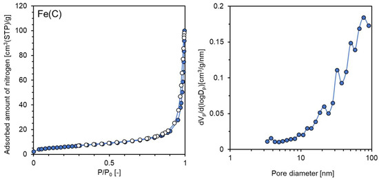 (left) Adsorption (blue) and desorption (white) isotherms of nitrogen and (right) pore size distribution for Fe©.