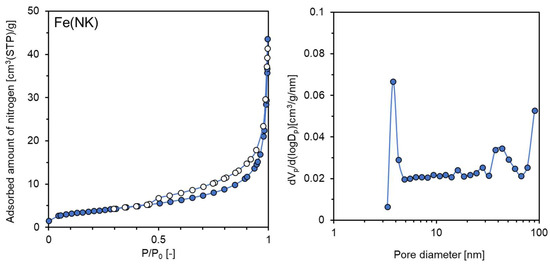 (left) Adsorption (blue) and desorption (white) isotherms of nitrogen and (right) pore size distribution for Fe(NK).