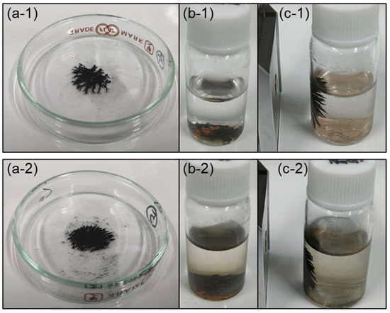 Appearances of the samples of (a) air-exposed for 3 days, (b) water-soaked for 3 days, and (c) magnetic properties shown when magnets were placed next to the sample bottles for (1) Fe(C) and (2) Fe(CNK).