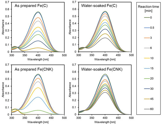 Figure 10 shows the reaction time depending on changes in absorbances corresponding to 4−NP (401 nm) and 4−AP (313 nm) for the as-prepared and water-soaked samples. Figure 11a shows the concentration changes of 4−NP during the reactions, which were obtained from the absorbance changes in Figure 10. As for the as-prepared Fe(C) and Fe(CNK), the absorbances at 401 nm gradually decreased and approached zero for 60 min. At the same time, the absorbances at 313 nm increased due to the decrease in absorbances at 401 nm. The selectivities from 4−NP to 4−AP after 60 min were 83.6% for both samples, which were calculated using calibration curves obtained at 313 nm (Figure 12). The results suggested that most of the 4−NP reactants were converted to 4−AP with few byproducts. In the initial stage of the reactions at 0–10 min, the decreasing changes in concentrations were almost the same as those of the as-prepared Fe(C) and Fe(CNK), as shown in Figure 11a. However, after the stage, the as-prepared Fe(CNK) showed a quicker drop in the concentration than the as-prepared Fe(C), and zero concentrations were obtained at 30 min and 60 min with the as-prepared Fe(CNK) and Fe(C), respectively. It quite interesting that the low surface area Fe(CNK) showed a higher catalytic performance than the high surface area Fe(C). This could be because the surface of Fe(CNK) was more activated during the annealing treatment in molten NaOH-KOH than the surface of Fe(C) that was formed by the reduction treatment by CaH2. Thus, the molten salt reduction was a superior approach to obtain the more active surface that is available for the catalytic hydrogenation.