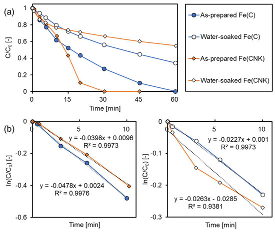 (a) Changes in 4−NP concentration versus reaction time, and (b) the plots of ln (C/C0) versus initial reaction time for Fe(C) and Fe(CNK) with as-prepared and water-soaked conditions, where C is the time-changing concentration and C0 is the initial concentration of 4−NP. Equations obtained with linear approximation are shown in the figures.