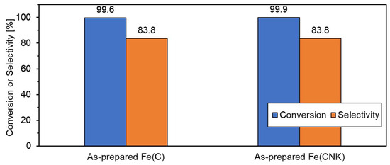 Conversion of 4−NP and selectivity to 4−AP after 60 min reactions for as-prepared Fe(C) and as-prepared Fe(CNK).