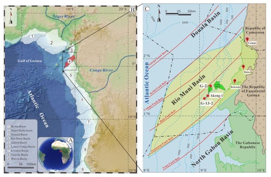 - Dailly, P.; Goh, K.; Lowry, P. The Rio Muni Basin of Equatorial Guinea: A New Hydrocarbon Province. In Petroleum Systems of Deep-Water Basins–Global and Gulf of Mexico Experience; Fillon, R.H., Rosen, N.C., Weimer, P., Lowrie, A., Pettingill, H., Phair, R.L., Roberts, H.H., van Hoom, H.H., Eds.; SEPM Society for Sedimentary Geology: Tulsa, OK, USA, 2001; Volume 21, pp. 241–251. ISBN 978-0-9836096-9-8. [Google Scholar]