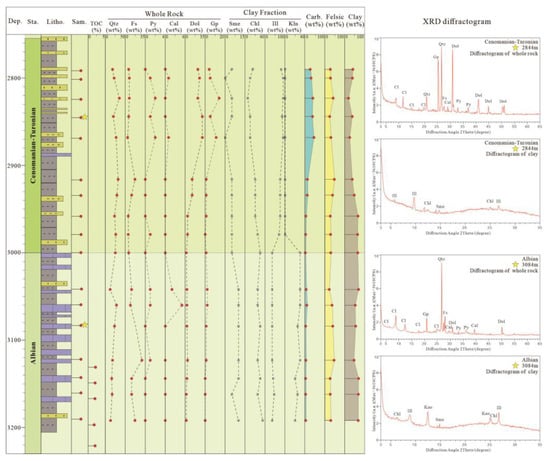 | Stage | Depth (m) | Whole-Rock Minerals, wt% | Clay Minerals, wt% | Lithofacies Types | |||||||||