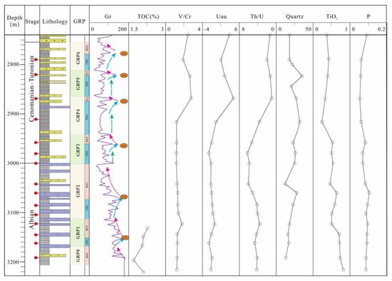 | Stage | Depth (m) | V/Cr | Uau (μg/g) | Th/U | TiO2 (w%) | P (μg/g) | Rock Colour |