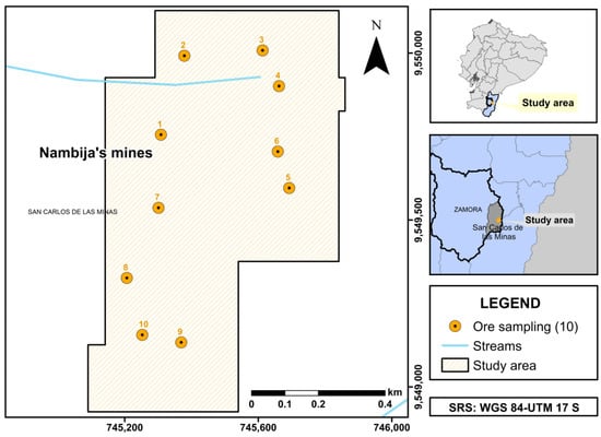 The Nambija mining district is located in the southeastern region of Ecuador, 25 km from the city of Zamora, in the parish of San Carlos de las Minas on the western flank of the Nanguipa mountain range (Figure 1). It comprises the northern and southern condominiums of a 69-hectare mining concession legally granted by the Ecuadorian state. The terrain is rugged, with altitudes varying between 1500 and 2100 m above sea level. The climate is typical of the inter-Andean region, with temperatures ranging between 18 and 24 °C and annual rainfall between 200 and 300 mm. The main economic activity in Nambija is mining [28]. However, informal mining activities, a lack of technical guidance in operations [27], and the rudimentary processes used for Au extraction [29] have resulted in large amounts of waste and tailings throughout the surrounding sector. Mining wastewater laden with a high content of heavy metals and the emission of mercury into the environment have altered the quality and physicochemical properties of the soil and water.