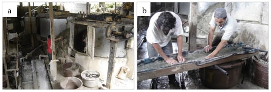To recover gold from the tailings collected in the sluices and sedimentation boxes, miners rework the tailings in a trough (Figure 4) and then concentrate it with pan or batea. The panning is one of the processes used to obtain the gold–mercury amalgam. It consists of separating the amalgam from the finer material by making circular movements in a convex pot-shaped container [44].