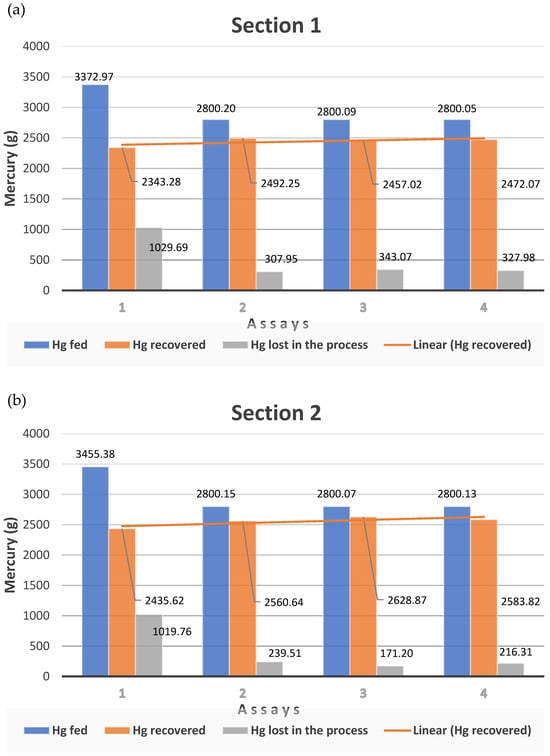 Similarly, the results are consistent with what was observed when processing the tailings from the panning, since there was an increase in the recovery of gold (already amalgamated) and mercury when processing the sand from the sedimentation tanks, ranging from 8.74% recovered in test 1 to 10.75% in the best case (test 4) in Section 1 and from 8.53% (test 1) to 12.18% in the best case (test 4) in Section 2. This increase can be attributed to the use of the centrifugal concentrator that replaces the manual tilling of the tailings in a chute.