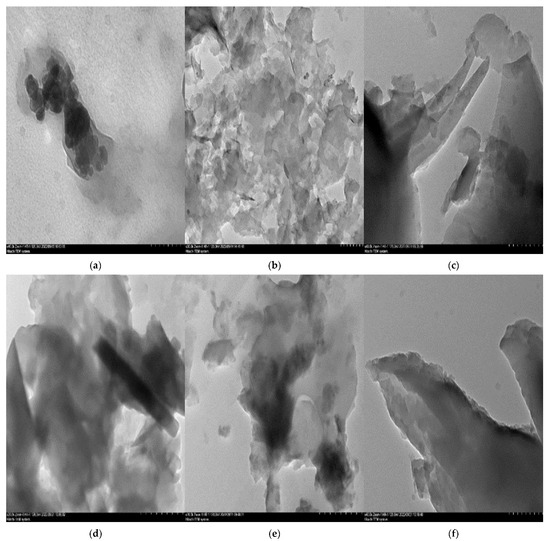 From Figure 2a, it can be seen that pure melamine formaldehyde resin forms as aggregated microspheres and aggregates develop in three dimensions [67]. This textural arrangement is due to the use of the microwave-irradiation-assisted foaming method before curing. Figure 2b shows that the MF molecule clusters become regularly sparse or disaggregated, preserving their spherical structure, due to the exfoliation of the organo-clay platelets into the polymer matrix [68]. The HRTEM image of the MF-organo-clay–pumice composite (MFCPHC) in Figure 2c shows that the pumice has a vesicular coarse-textured and glassy structure, but the particles are effectively surrounded by spherical polymer clay nanocomposites [69]. From the HRTM image of the MF-organo-clay–pumice–gypsum hybrid composite (MFCPGHC) in Figure 2d, it can be seen that relatively regular gypsum plates are heterogeneously dispersed next to the pumice plates with a glassy structure, and the particles are surrounded by distinctly deformed polymer clay nanocomposite spheres [70]. On the other hand, in the image of the MF-organo-clay–kaolinite hybrid composite (MFCPKHC) in Figure 2e, it can be seen that coarse-textured glassy pumice plates, spherical polymer clay nanocomposites and kaolinite plates can exhibit an effective blending [71]. The HRTM image of the MF-organo-clay–hollow-glass-sphere hybrid composite (MFCPHHC) in Figure 2f shows that the pumice plates exhibit a more regular and relatively uniform arrangement with the inclusion of hollow glass spheres encapsulated by spherical polymer clay nanocomposites [72].