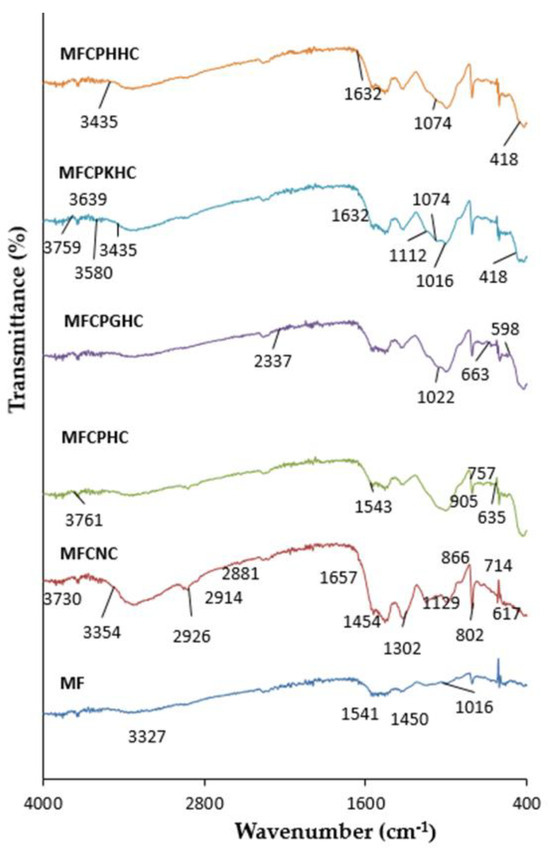 In the FT-IR spectrum of the MF-organo-clay–pumice composite (MFCPHC) in Figure 4, besides the characteristic peaks of organo-clay and MF origin, slightly shifted and low-intensity peaks corresponding to Al-OH bending vibrations and Si-O stretching vibrations appeared at 905 and 757–635 cm−1. Similar to the other spectra, the peak around 3761 cm−1 indicates the presence of hydroxyl groups originating from water [76,83]. The lower peak intensities and shifts can be attributed to the effective interactions between pumice plates and organo-clay layers, as implied with the HRTEM images of this hybrid composite.
