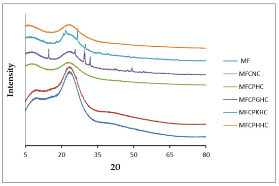 Figure 5 shows that in the XRD pattern of the MF resin, two typical broad peaks appear at 9.4° and 23.8°, indicating an amorphous structure. This means that formaldehyde resin of melamine is formed from the methylol monomers and propagation of the polymeric backbone takes place. It can be seen from Figure 5 that the smaller of the two peaks of MF resin is partially overlapped with the characteristic smectite peak at 8.1°. [81,87]. This left-shifted and enlarged smectite peak clearly shows that polymer molecules are intercalated in the interlayer space of the clay and the nanocomposite is formed. The HRTEM image in Figure 2b also supports this claim.