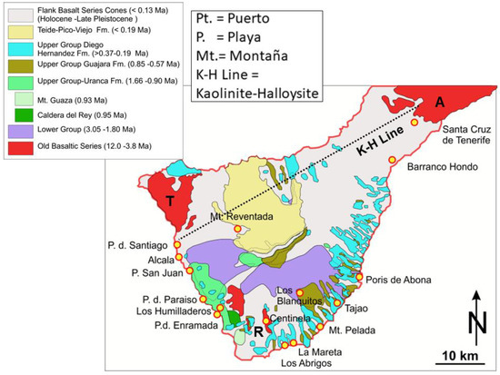 The polygenetic evolution of Tenerife, Spain, (modified from [65]); the sampling sites of critical elements are given by the yellow dots framed in red.
