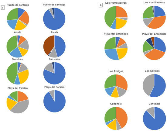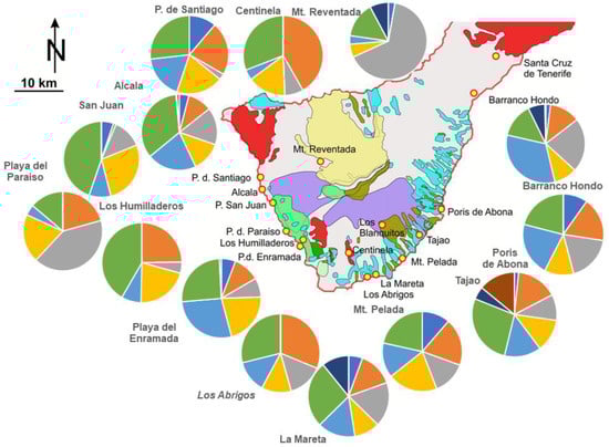 The Isle of Tenerife is the largest island and the “heart” of the Canary Islands Archipelago, as can be deduced from the volcano-geodynamic map depicting the various stages of the evolution of the volcanic islands with the age of formation decreasing from East to West (Figure 2) [12]. The largest island of the Archipelago is made up of three basement areas (shield stage), Roque del Conde (11.0 to 3.5 Ma), Teno (6.7 to 4.5 Ma), and Anaga Massifs (>6.5 to 3.3 Ma), with the younger Teide Volcano in the center of the rift triple junction (Figure 2) [58,59,60,61,62]). The Canary Island Archipelago is a marine hotspot area in front of the African continent [11,13,63,64]. The most recent study heralding the complex and polygenetic evolution of the hotspot island under consideration has been published by [65] (Figure 2 and Figure 3).