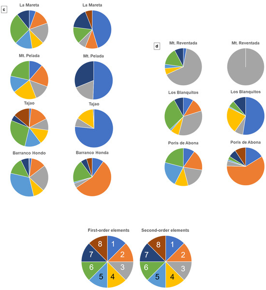 Rare elements of the first and second-order mineral assemblages at the various sites. (a) Puerto de Santiago, Alcala, San Juan, Playa del Paraiso. (b) Los Humilladeros, Playa del Enramada, Los Abrigos, Centinela. (c) La Mareta, Montaña Pelada, Tajao, Barranco Hondo. (d) Montana Reventada, Los Blanquitos, Poris de Abona plus legend: First-order elements (1) Be, (2) Zr, (3) F, (4) Ti, (5) Nb, (6) REE+Y, (7) Li+Cs, (8) Sn-W, Second-order elements (1) Mn, (2) Pb, (3) Fe, (4) U+Th, (5) As+Sb, (6) V, (7) S+B, (8) Cu+Zn+Mo+Au.