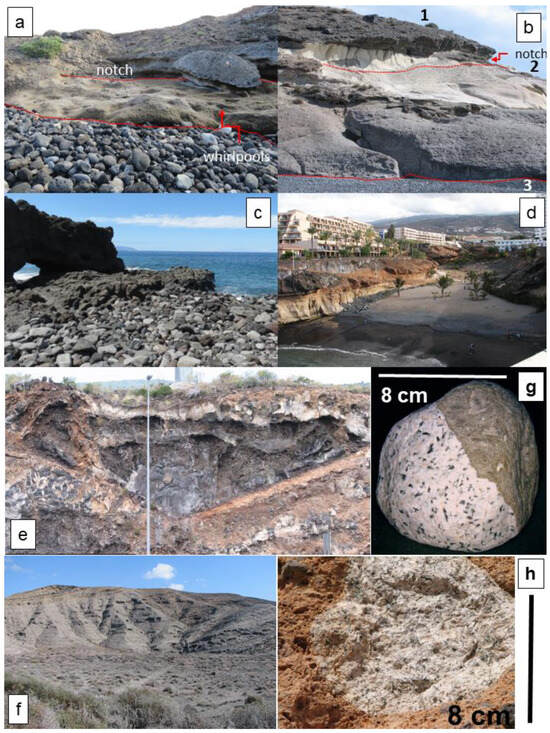 Mass wasting and fluvial landforms: Barrancos (V-shaped deep gorges) are quite common and run subparallel to the volcanic and pyroclastic flow deposits. As ephemeral drainage systems, the channels are chocked with lithoclasts and only a small-sized fraction arrives to the coastal traps (Figure 5d,e). In the zone under consideration, gravity-driven land-forming processes are mainly of the fall type (Figure 5d).
